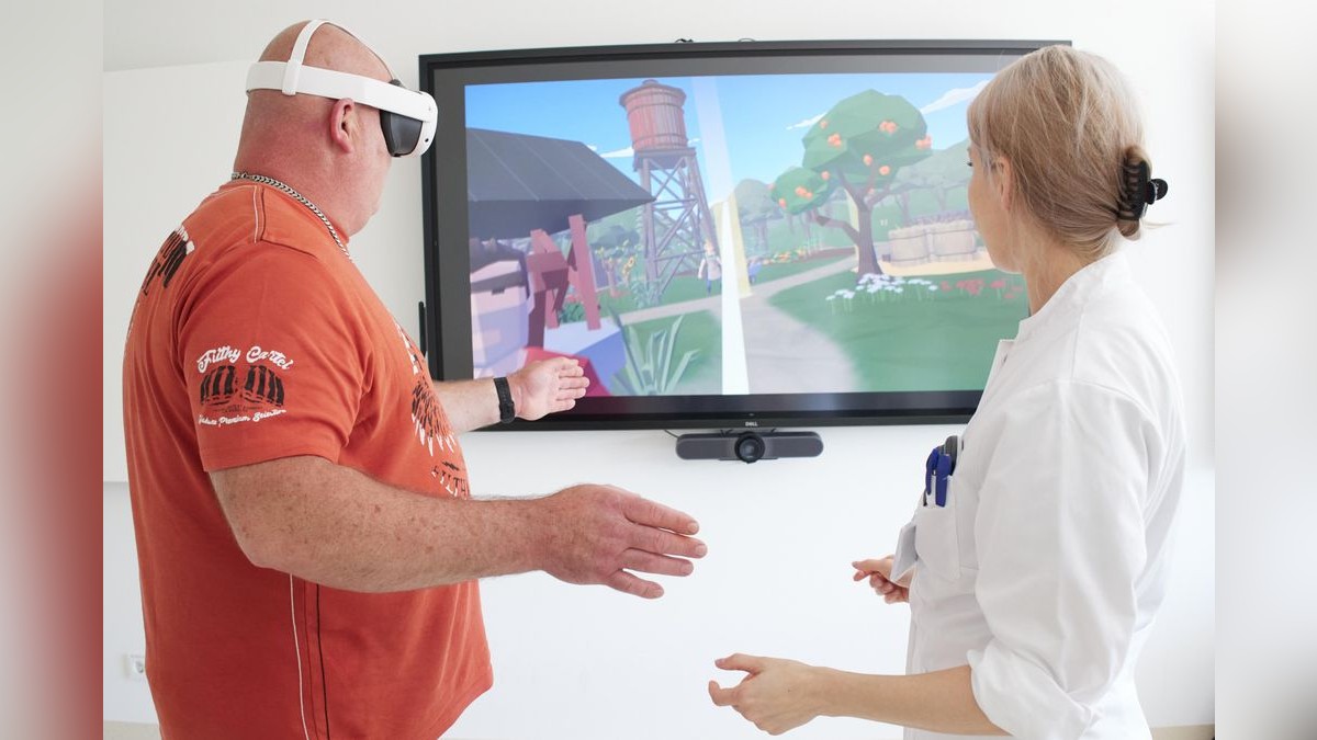 An immersive virtual farm invites you to explore, with interactive tasks designed to train hand and finger movements.